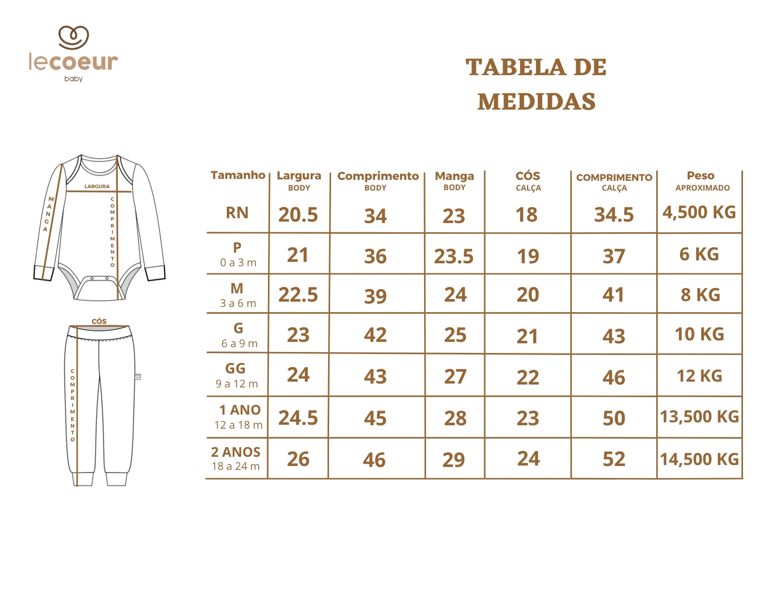 O conjunto é composto por 1 body manga longa e 1 calça saruel na cor Café Com Leite. Um look completo, quentinho e confortável para os dias mais frios, com toque macio e modelagem prática para o dia a dia do bebê.