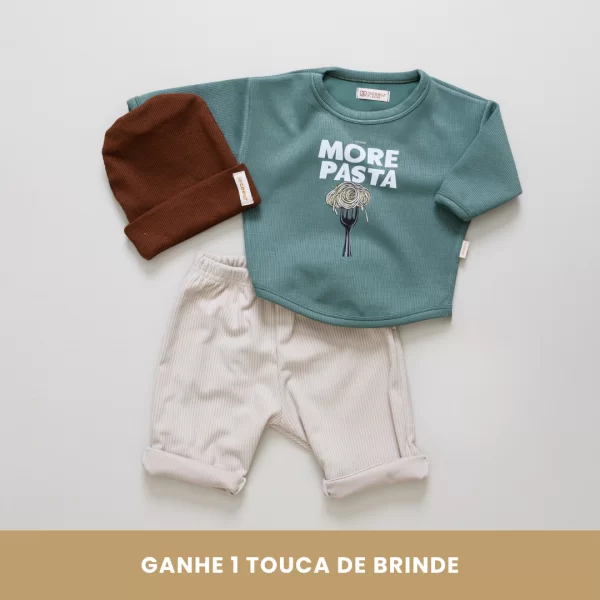 Look completo para você não perder tempo! Você compra o blusão over manga longa feito em malha 100% algodão e bem quentinha, com um toque super macio e uma qualidade que você vai amar! Junto com a calça saruel em veludo cotelê super estilosa e moderna e você ganha de brinde a touca! Peças com design minimalista, modernas e cheio de estilo. Com modelagem ampla, pensada para oferecer praticidade na hora da troca e muito conforto e estilo para o seu bebê em todos os momentos do dia.