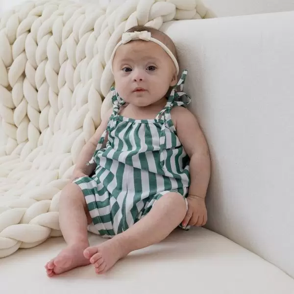Delicadeza e charme em cada detalhe! Nosso macacão infantil é confeccionado em tecido 100% algodão, leve e fresquinho, perfeito para os dias mais quentes. Com listras atemporais que dão charme e alegria ao guarda-roupa do seu bebe, ele traz um toque romântico que encanta.